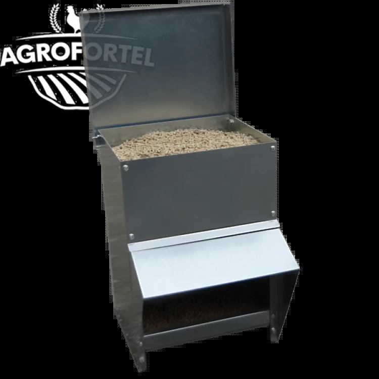 Představujeme Vám kvalitní násypné krmítko značky AGROFORTEL. Šikmá střecha na přední straně této násypky zabraňuje navlhnutí krmiva.